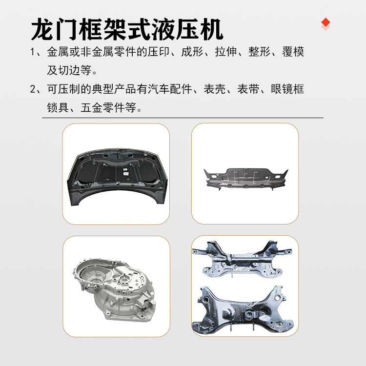 【產(chǎn)品描述】:30噸龍門框架式液壓機(jī)是一種高效、精準(zhǔn)的壓力成型設(shè)備,廣泛應(yīng)用于各種金屬、非金屬材料的壓制、成型和校正工藝中。其獨(dú)特的龍門框架設(shè)計(jì)和強(qiáng)大的液壓驅(qū)動(dòng)系統(tǒng),使其具有出色的穩(wěn)定性和工作效率,成為現(xiàn)代工業(yè)生產(chǎn)中不可或缺的重要設(shè)備。 30噸龍門框架式液壓機(jī)采用高強(qiáng)度鋼材構(gòu)建龍門式框架,保證了設(shè)備的穩(wěn)固性和剛性。機(jī)身采用優(yōu)質(zhì)鋼板焊接而成,經(jīng)過(guò)精細(xì)的熱處