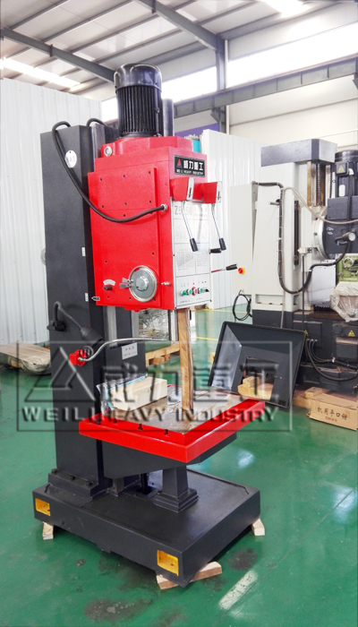 【產品描述】:立式鉆床 主軸豎直布置且中心位置固定的鉆床,簡稱立鉆。常用于 機械制造和修配工廠加工中、小型工件的孔。 立式鉆床加工前,須先調整工件在工作臺上的位置,使被加工孔中心線對準刀具軸線。加工時,工件固定不動,主軸在套筒中旋轉并與套筒一起作軸向進給。工作臺和主軸箱可沿立柱導軌調整位置,以適應不同高度的工件。 立式鉆床作為鉆床的一種,也是比較常見的